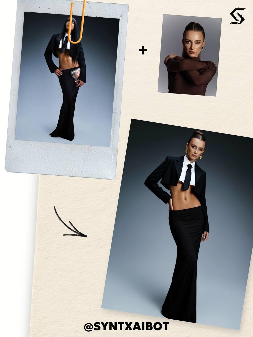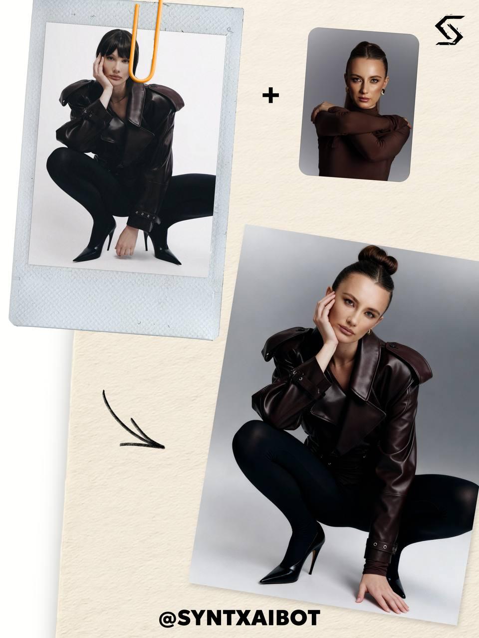 Plain textСоздай гиперреалистичное фотографическое изображение строго следуя этим указаниям: используй изображение 1 как исчерпывающий визуальный референс для точных черт лица и выражения, причёски, текстуры волос и укладки, дизайна и вида сережек, текстуры и тона кожи, общей эстетики и стиля персонажа. Полностью перенеси с изображения 2 позу тела, включая положение корпуса, изгибы спины, плеч, углы всех суставов (локти, колени, запястья), ориентацию и положение конечностей, наклон и разворот головы, ракурс и перспективу камеры, весь комплект одежды, её крой и фактуру.