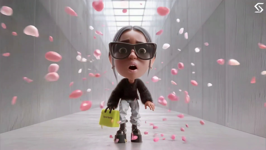 A girl with a big head in the style of big head caricature, long straight dark hair, large dark sunglasses. She was wearing a black long - sleeved top, light blue jeans, and black knee - high boots. She holds a small black handbag in her hand. He's blowing up a big pink bubble out of chewing gum. It stands in a modern minimalist interior with white and gray concrete walls, large panoramic windows, soft natural lighting. 3D rendering style, disproportionately large head, small body, realistic textures, clean lines, modern design. --ar 16:9 --v 7.0 --stylize 950📏 Сохраняем понравившуюся картинку и обязательно делаем масштаб тонкий (upscale), чтобы получить высокое разрешение под рекламу, баннеры и будущий ролик.